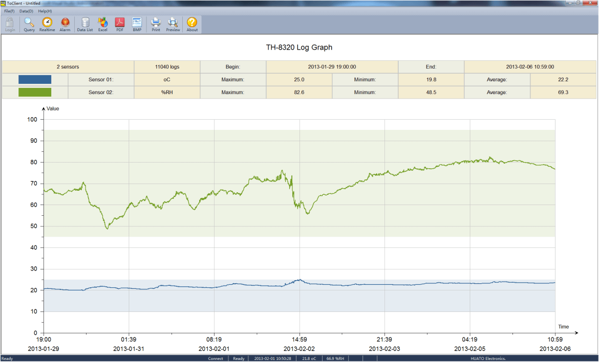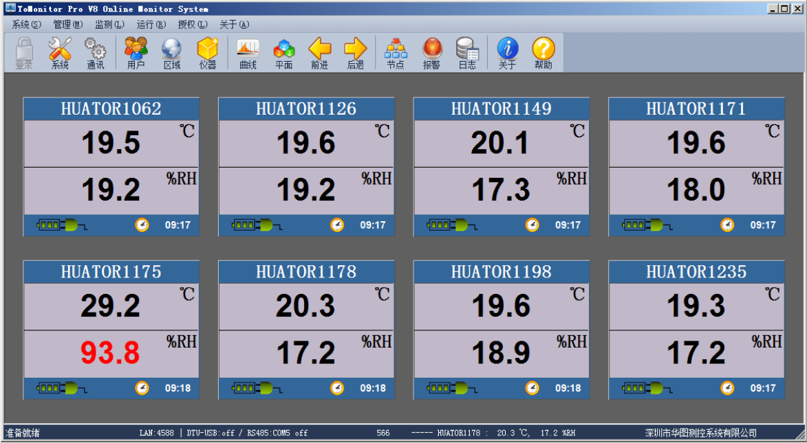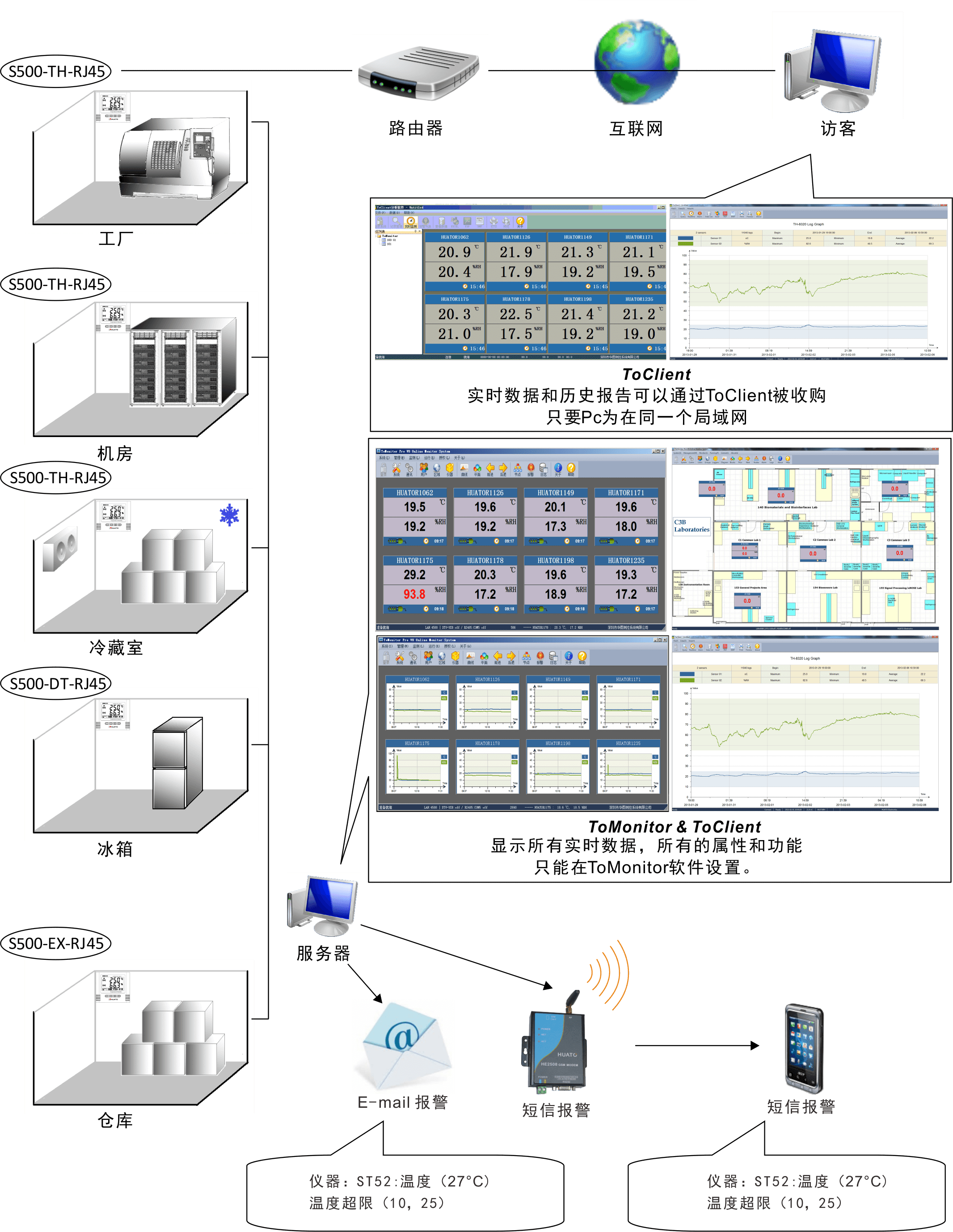 ToMonitor软件:根据用户的设置间隔自动上传实时数据。所有的设置可以通过ToMonitor软件,如刷新间隔,记录间隔,声音报警,短信报警,电子邮件报警等进行。ToClient软件:历史数据可以由ToClient软件被搜索。历史数据可以下载为BMP图,EXCEL,TXT。
