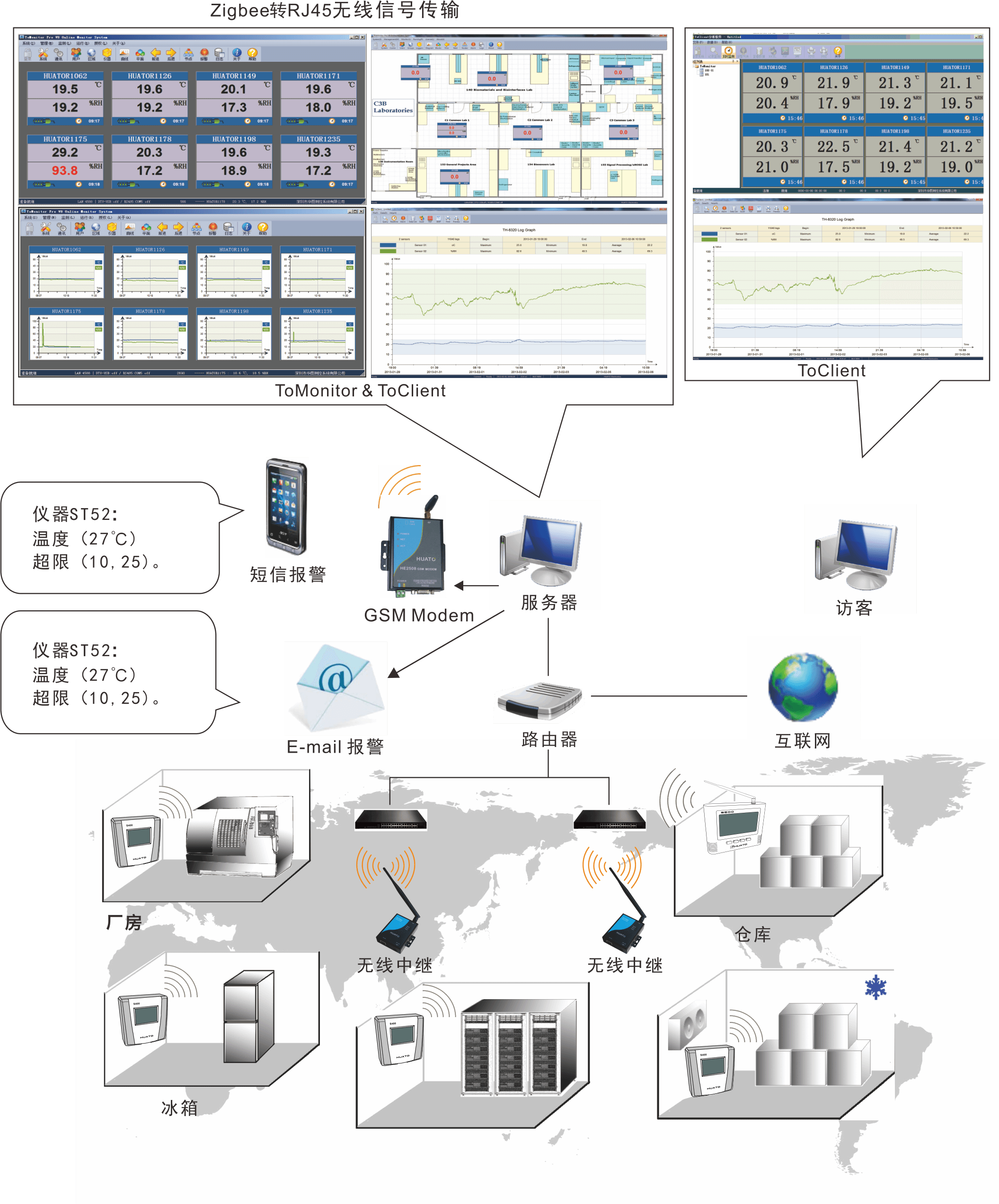 实现温湿度中央央监控和集中管理,广泛应用于农业研究、食品、医药、仓库、冷库、冰箱、机房、化工、气象、环保、电子、实验室等领域的温湿度监测,典型客户包括中国国家博物馆、国家电网公司、案馆、香港南洋烟草、上海味觉糖、华大基因研究院、江苏省农科院等知名单位。
